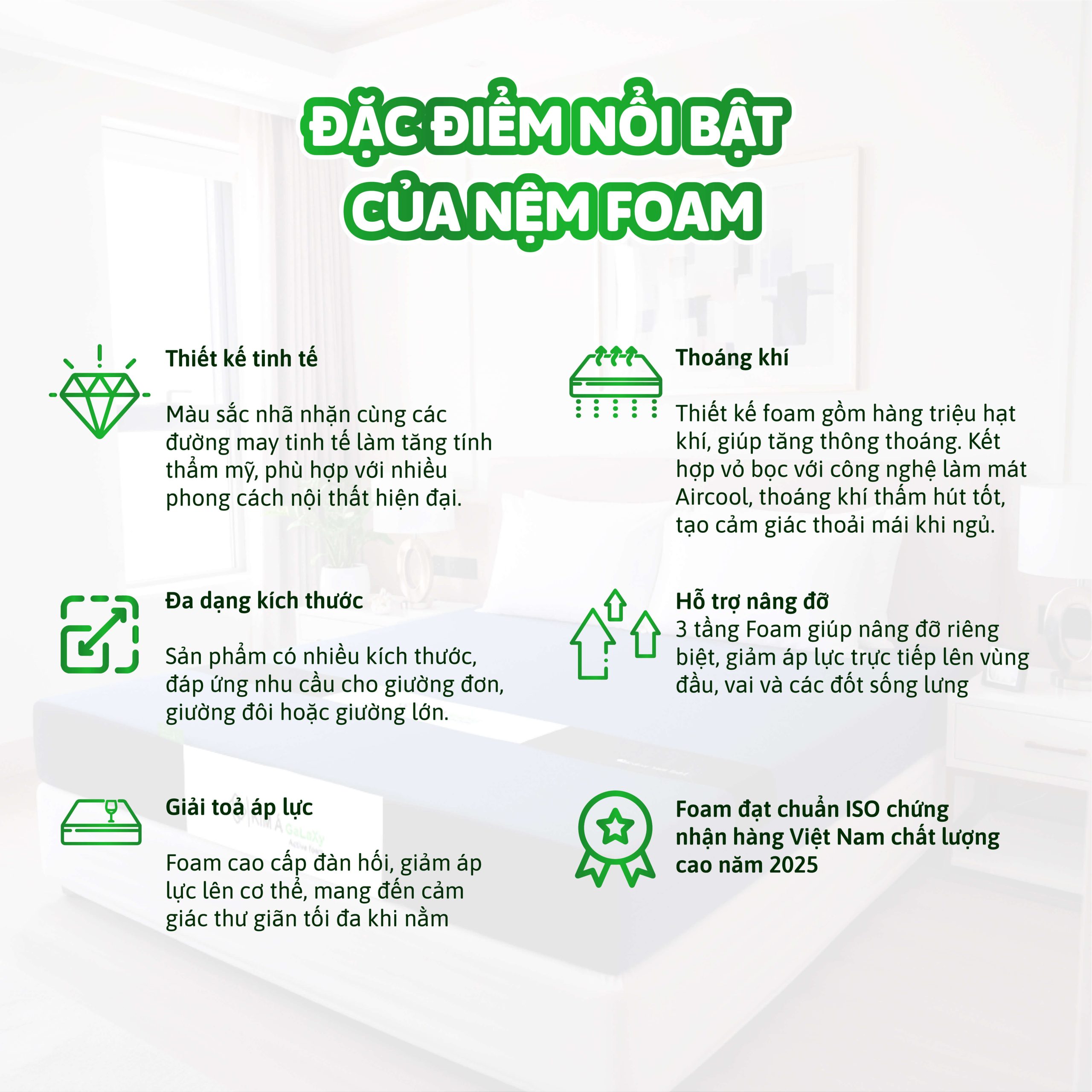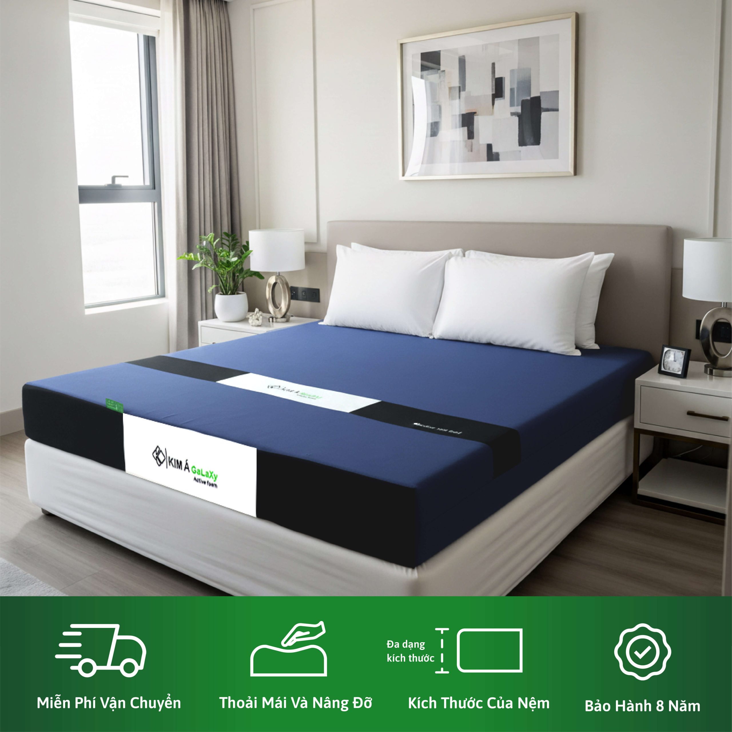 Nệm Memory Foam hoạt tính – Kim Á Galaxy có thể đáp ứng nhu cầu của nhiều khách hàng khác nhau, giúp nâng cao chất lượng giấc ngủ và sức khỏe của người dùng. Với tính năng kháng khuẩn và chống nấm mốc của foam hoạt tính, Nệm Foam KIM Á Galaxy hoạt tính rất thích hợp cho những người quan tâm đến vấn đề vệ sinh và sức khỏe, hoặc có xu hướng bị dị ứng và bệnh liên quan đến vi khuẩn.
